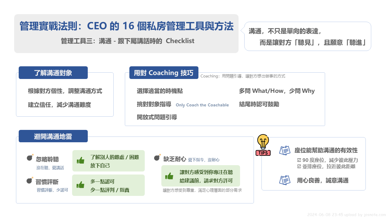 筆記摘自蔡恩全老師在 Master Cheers 的系列課程,章節片段不長,大約 12 分鐘,但有許多讓人省思的地方,也包含了一部分對過去自己答案的肯定,雖然是談管理、對部屬溝通,但除了 coaching 的部分比較屬於帶人的層面,其他的提點也很適用各種溝通場景。