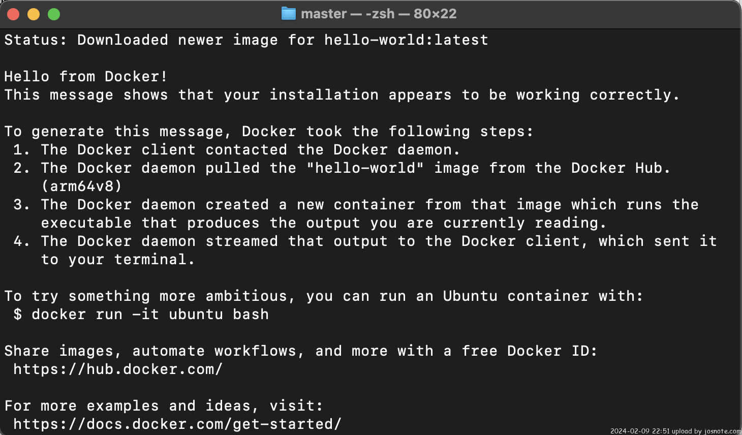 最後,在終端機試著 run hello-world image 確認服務正常