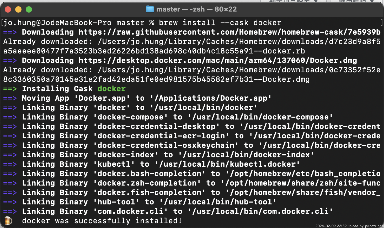 brew install --cask docker(安裝過程中可能需要輸入當前登入帳號的密碼)