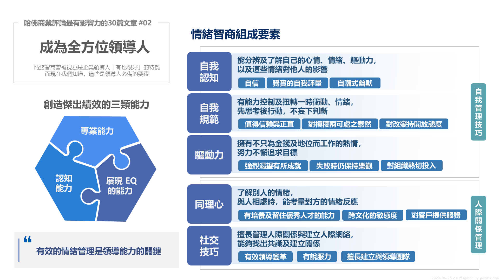 在閱讀這篇文章後,我整理成一頁筆記幫助自己回顧文章的內容,也是提醒自己不論擔任什麼角色,都能持續練習 EQ,做有效的情緒管理。